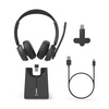 Kabelloses Headset für einen aufgeräumten Arbeitsplatz ohne Kabelwirrwarr und freie Hände beim Gespräch. Egal, ob PC, Laptop, Tablet oder Smartphone, mit dem Office-Headset verbinden Sie gleichzeitig bis zu zwei Geräte über Multipoint - sagen Sie Ade zum lästigen Umstecken. On-Ear-Kopfhörer mit gepolsterten Ohrmuscheln und Kopfbügel für einen perfekten Sitz, auch wenn's mal wieder länger dauert. Der Mikrofonarm ist um 280° drehbar und somit für Rechts- und Linkshänder geeignet. Anruf- und Smartphonefunktionen steuern Sie über die Multifunktionstaste direkt an der Ohrmuschel des kabellosen Kopfhörers (z.B. Anrufe annehmen/tätigen/abweisen/Wahlwiederholung/Musik). Ladestation: Die Ladestatus-LED zeigt den Ladefortschritt an und dient gleichzeitig als Halterung für das Bluetooth-Headset bei Nichtgebrauch für einen aufgeräumten Arbeitsplatz. Extra langes Kabel für mehr Flexibilität und Bewegungsfreiheit und einen unkomplizierten Anschluss des kabellosen Headsets an PC oder Notebook. Hereinplatzen und losreden passiert nun nicht mehr, denn Ihre Kollegen erkennen an der roten LED, dass Sie in einem Call sind. Für ein konzentriertes Meeting nutzen Sie die Stereo-Variante mit zwei Ohrmuscheln, für ein lockeres Gespräch, bei dem Sie auch Ihre Umgebung wahrnehmen wollen, wechseln Sie in den Mono-Modus, indem Sie die rechte Ohrmuschel entfernen. Das Headset mit Mikrofon ermöglicht Voice-over-IP, z.B. Skype, Teams, Zoom, YouTube, Office Calls, Videokonferenzen und Co.